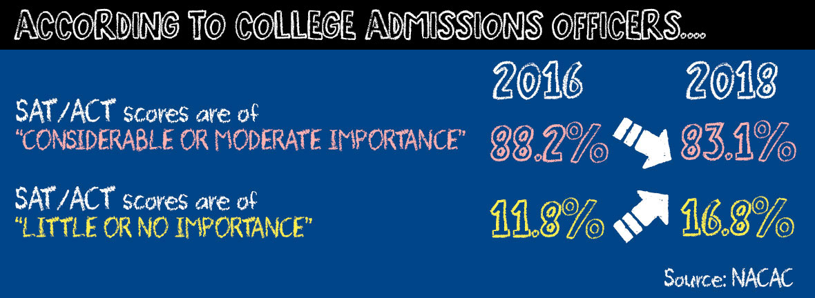 The National Association for College Admission Counseling (NACAC) annually asks admissions officers to rate the relative importance of various parts of students’ records, including counselors’ recommendations, test scores, courses they took, and class rank. In the 2018 survey, 83.1 percent of admissions officers reported that SAT/ACT scores are of “considerable or moderate importance.”