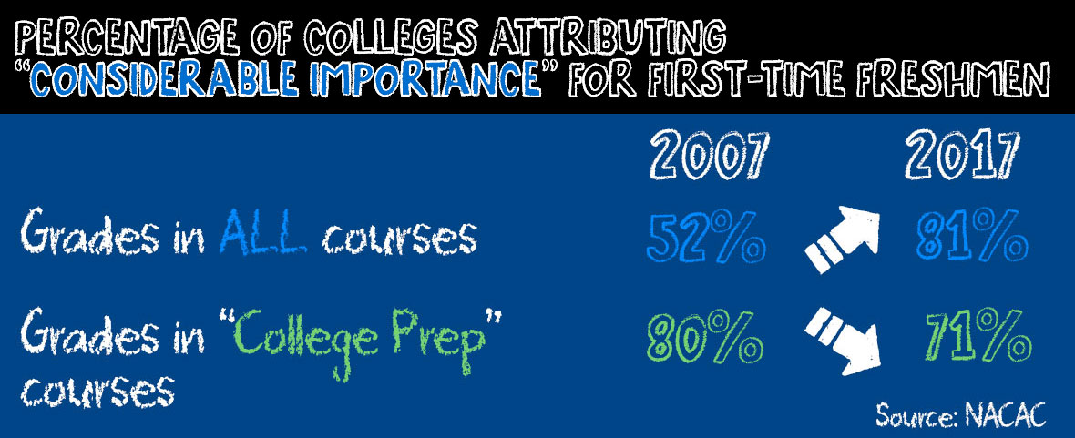 But it’s important for students and families to consider that admissions test scores are far from the only important criteria that colleges use to select qualified students. For instance, according to that same NACAC survey, the percentage of colleges attributing “considerable importance” to grades in all courses has jumped from 52 percent in 2007 to 81 percent in 2017! Back to Basics can also help with 1-on-1 tutoring to help students improve their grades in over 60 subjects. Learn more about our 1-on-1 tutoring services here.
