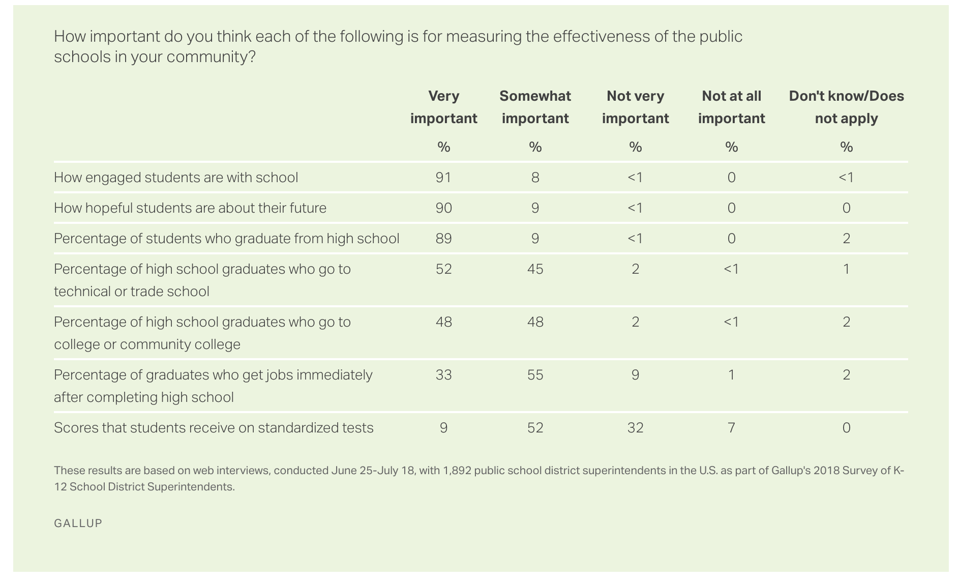 A recent Gallup poll found that nine in 10 of U.S. K-12 public school superintendents say that engagement with school, student hopes for the future, and graduation rates are very important measures of school effectiveness. But only 9% of those superintendents described standardized test scores in the same way.